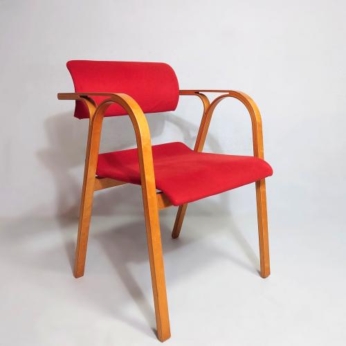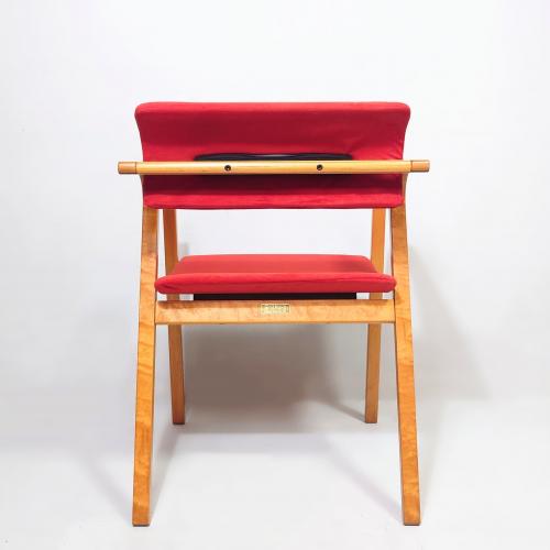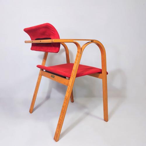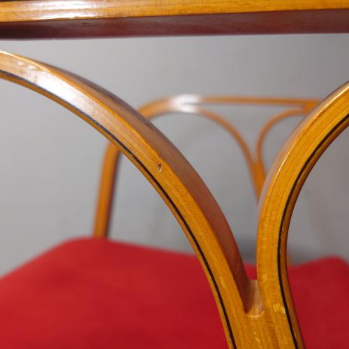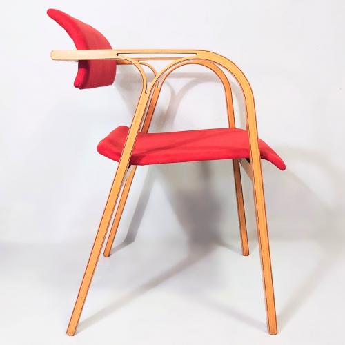 フレームの成形合板の中にスリーブ状の炭素繊維強化プラスチック(カーボン)の内圧成形した炭素繊維強化プラスチック(カーボン)を組み合わせており、曲木加工の美しさと新たな技術挑戦を感じる一脚。内部のカーボンは曲げ加工の補強としてだけではなく、成形合板の表面素材であるバーズアイメープルの高級感と共に曲木のラインのアクセントとしても機能しているカーボン。高い技術と耐久性、美しさを兼ね揃えたプロダクト。開発当時、製造数も少なかったようで、中古市場に出回ることが少ないアイテム。こちらのCCCチェアは座面、背もたれがファブリックのモデル。