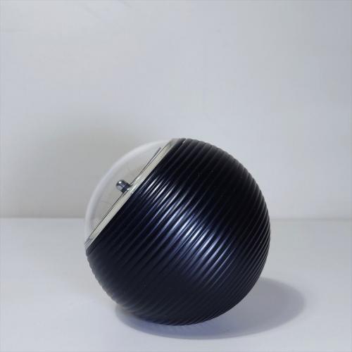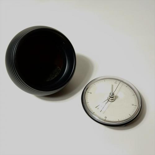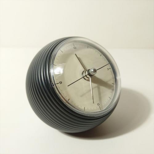 地球をモチーフにデザインされた美しい球形のデスククロック。秒針には流れるように動く「スウィープ運針」を採用し、ボディは重みのある真鍮製。高級感ある黒の半艶仕上げで、全体に同心円状のカーブラインが刻まれています。現在ではLemnosからボディの素材がアルミニウム製にて復刻販売されていますが、こちらは当時のオリジナルでずっしりとした重みの真鍮製となります。