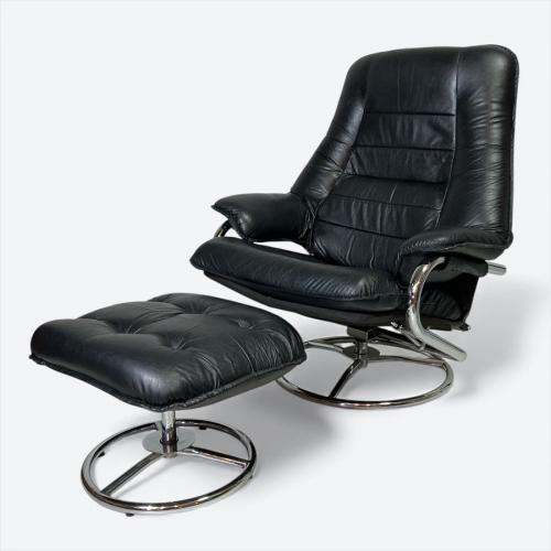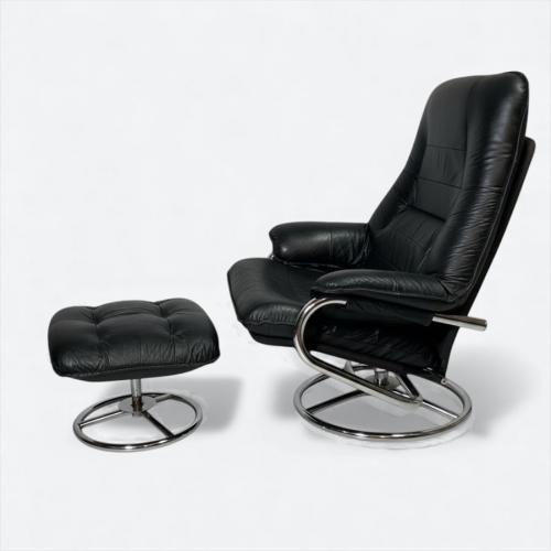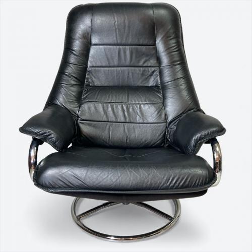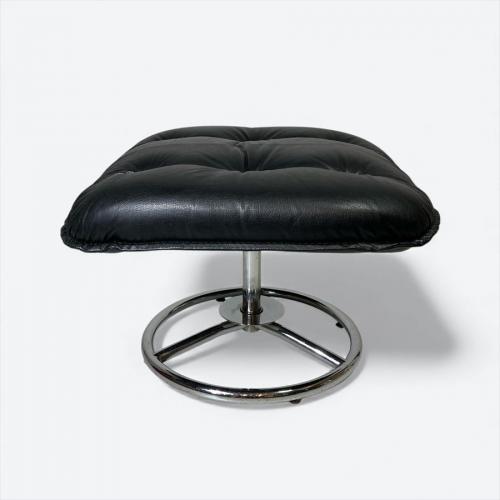 80年代以前のフランスベッドにて取り扱いのあったパーソナルチェア。オットマン付き(裏ジッパー破損)。レザー仕様(一部合皮)の高級感とミッドセンチュリーやスペースエイジ的なデザインが魅力的。機能は回転機能とレバー操作などがない体重をかけることによるリクライニング機能というシンプルさ。